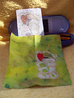 Да и ещё - у меня всегда ссобой какая-нибыдь маленькая вышивка, очень полезное занятие - противостресовое, а кто сидит в стрессе? пилоты конечно-же, они каждый момент используют на сканирование погодных условий. Пока они там обсуждают когда можно опять взлетать, я сижу и наслождаюсь любимым увлечением. Вот это результат моего творчества. Надо конечно ещё закончить и превратить в открытку к дню "варенья" или ещё чего-нибудь.